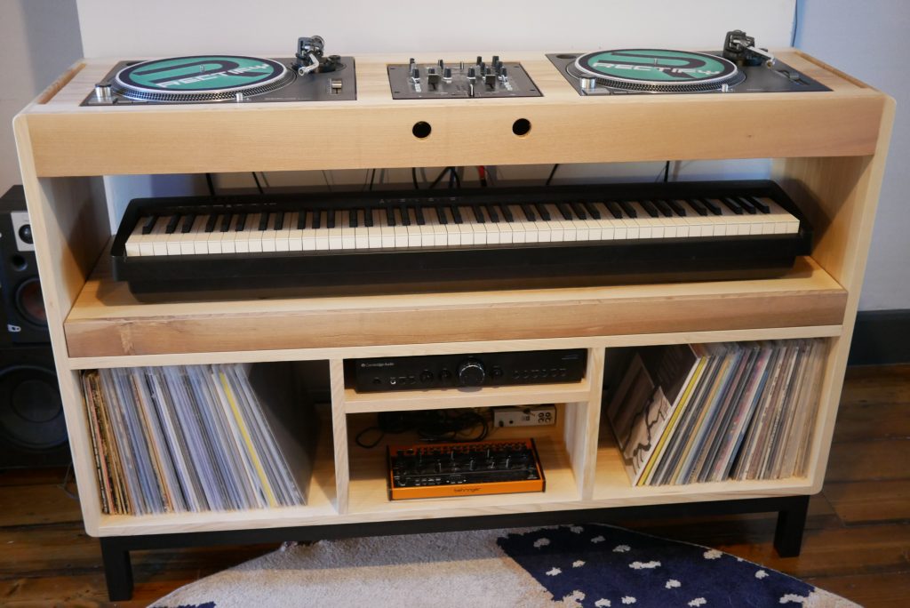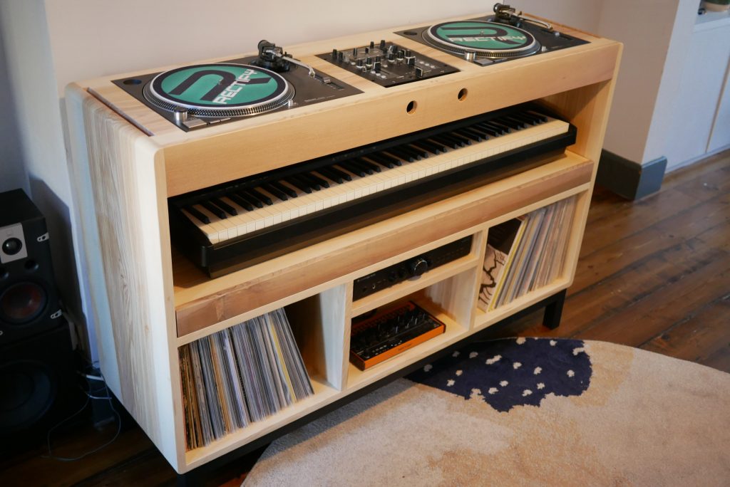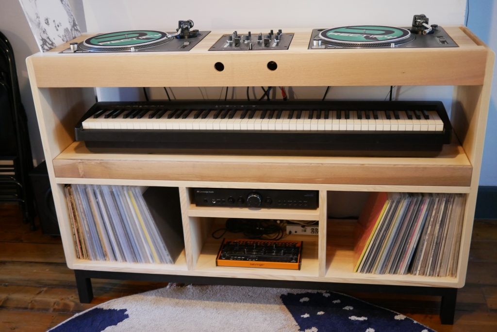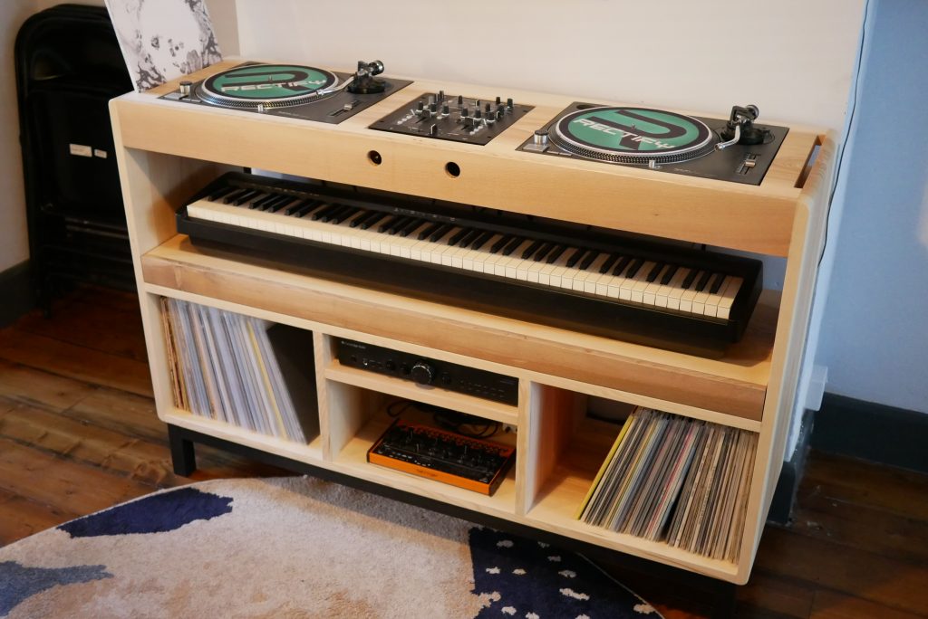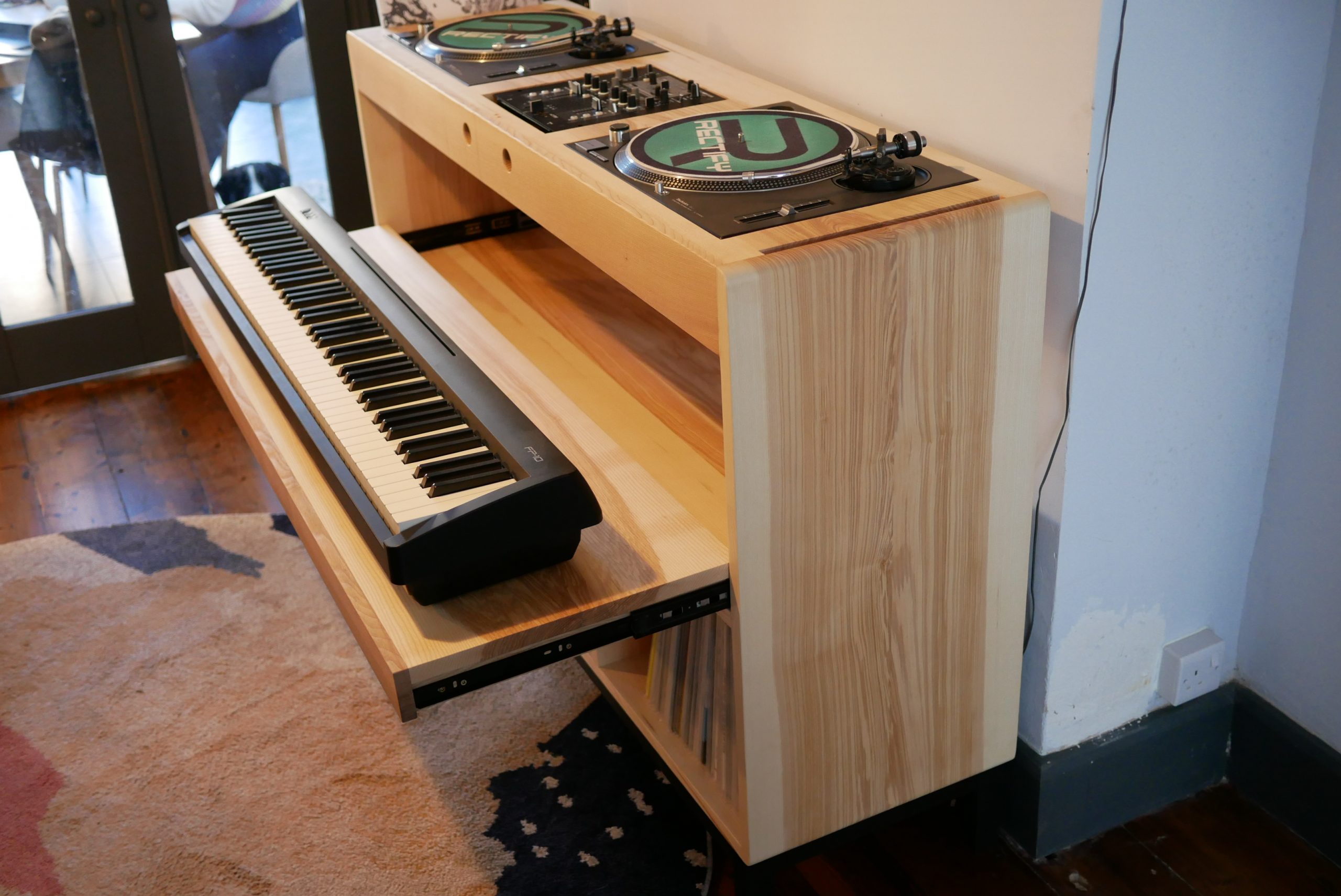 Custom made bespoke ash DJ unit, with push to open slide out keyboard shelf. Beautiful English ash finished with white hard wax oil to keep the raw ash look. The legs are ash which have been ebonised, this contrasts beautifully with the raw ash. Really enjoyed making this, and seeing it with the decks and mixer sitting perfectly in the cutouts on the top was so satisfying