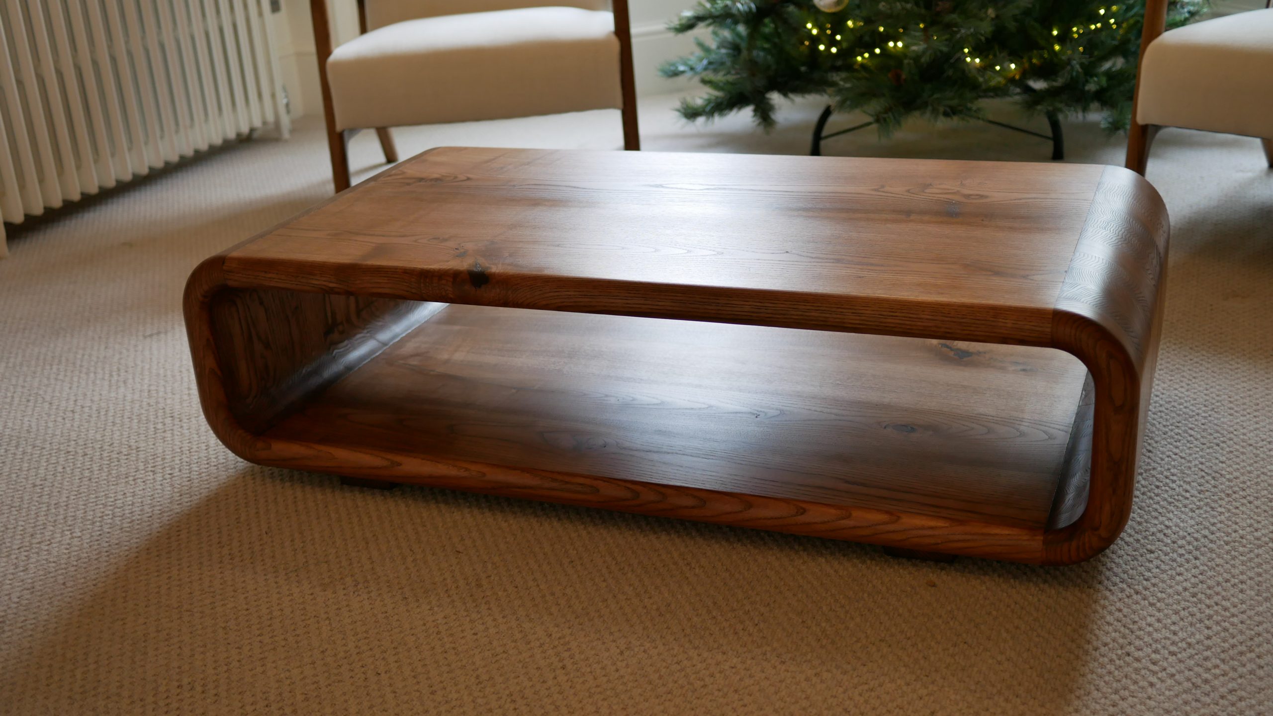 This curved coffee table is made using solid 2 inch thick English ash. It’s a unique, elegant and contemporary design that’s the perfect centrepiece for a living room. It’s 32.5cm high and has customizable width and depth. The piece in the photo has been stained a dark oak colour but it can be left in its natural colour or stained your desired tone. It is finished with hard wax oil which is robust for every day use and enhances the beauty of the grain.